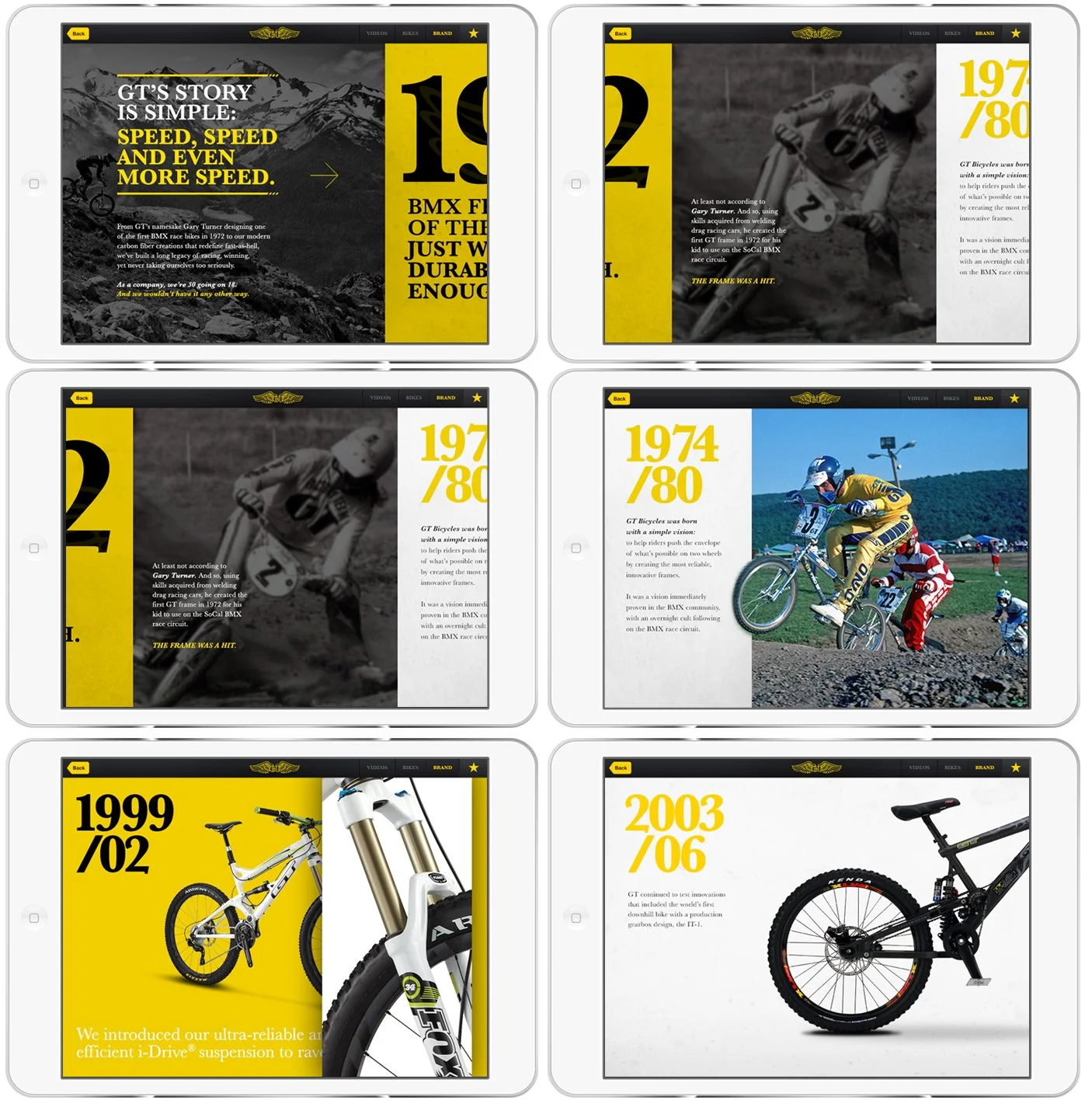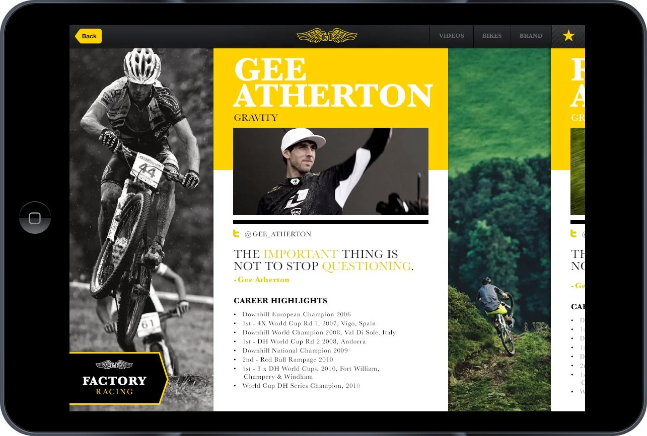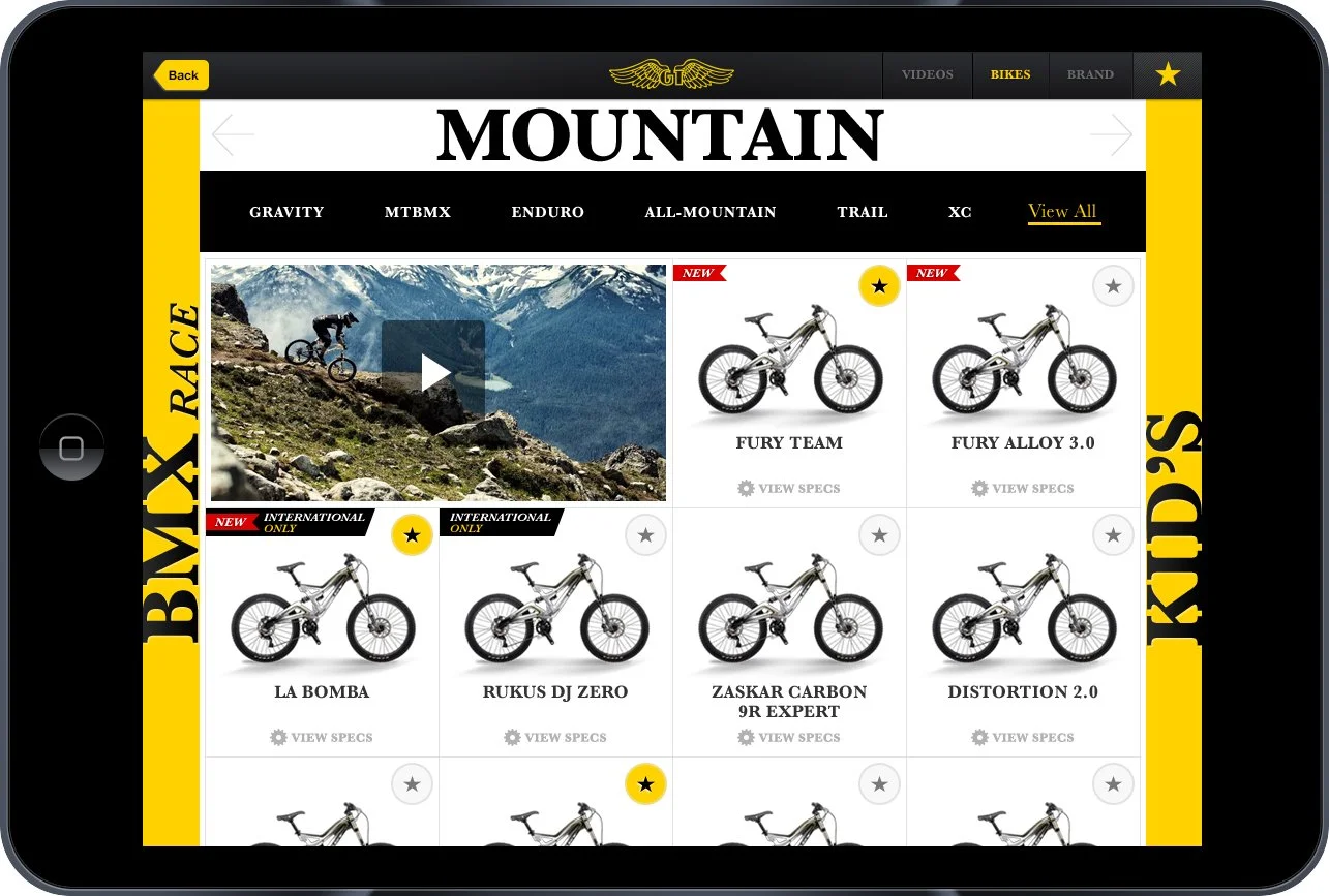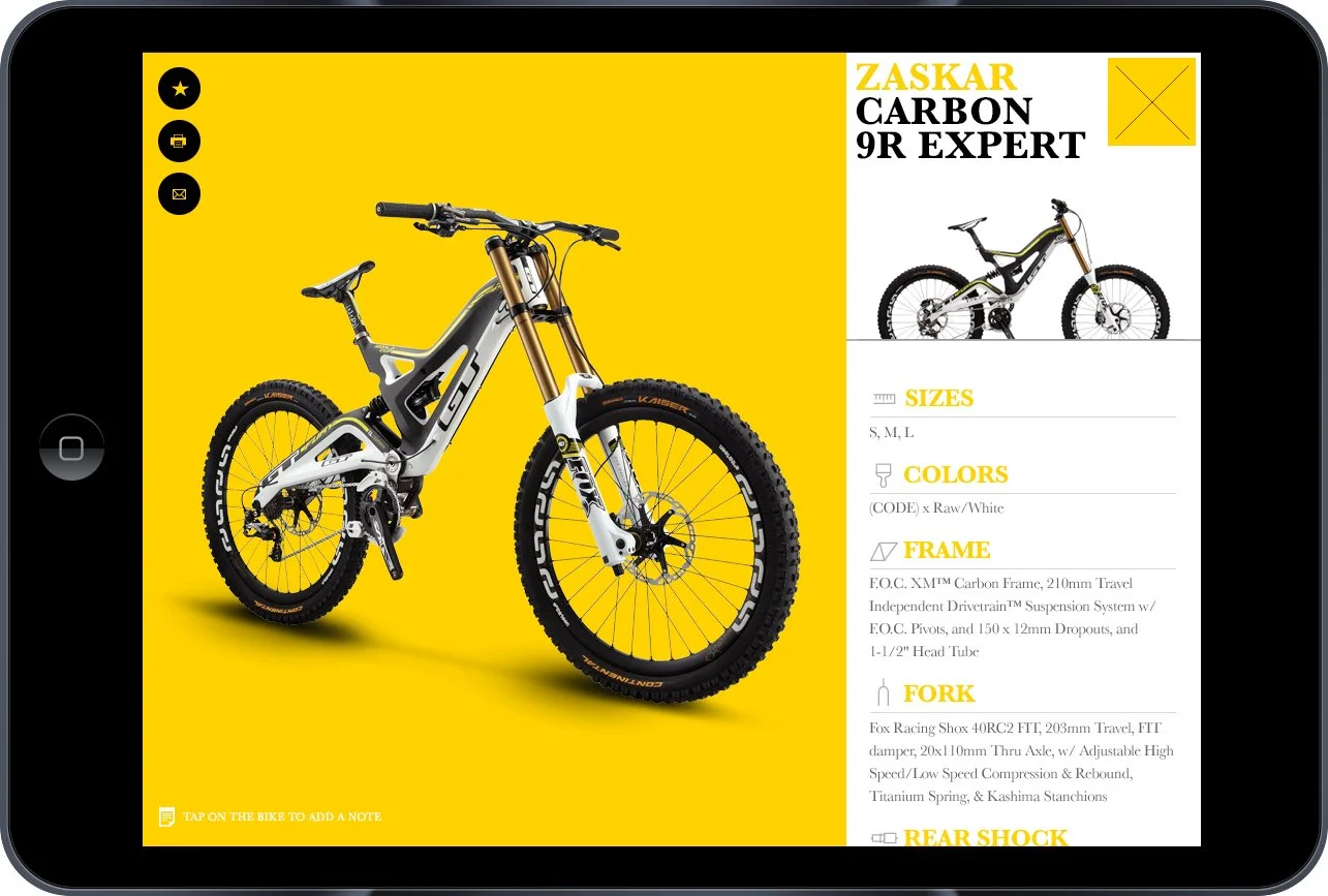 Mobile application created for GT Bicycles which is used during international bicycle trade shows throughout the year. The App replaced hundreds of dealer catalogs containing bike specs, images, and content from GT's inventory, all of which would otherwise be printed and handed out individually during the trade shows. The App empowers GT distributors with a digital version of the dealer catalog, containing all the traditional bike specs and images you'd expect from a dealer book, now with the added value of videos, a rich brand history, the ability to easily generate and save list of their favorite bikes, attach notes, and email the specs to individual bike shops. All of this is shareable and can easily be updated as new content becomes available..
